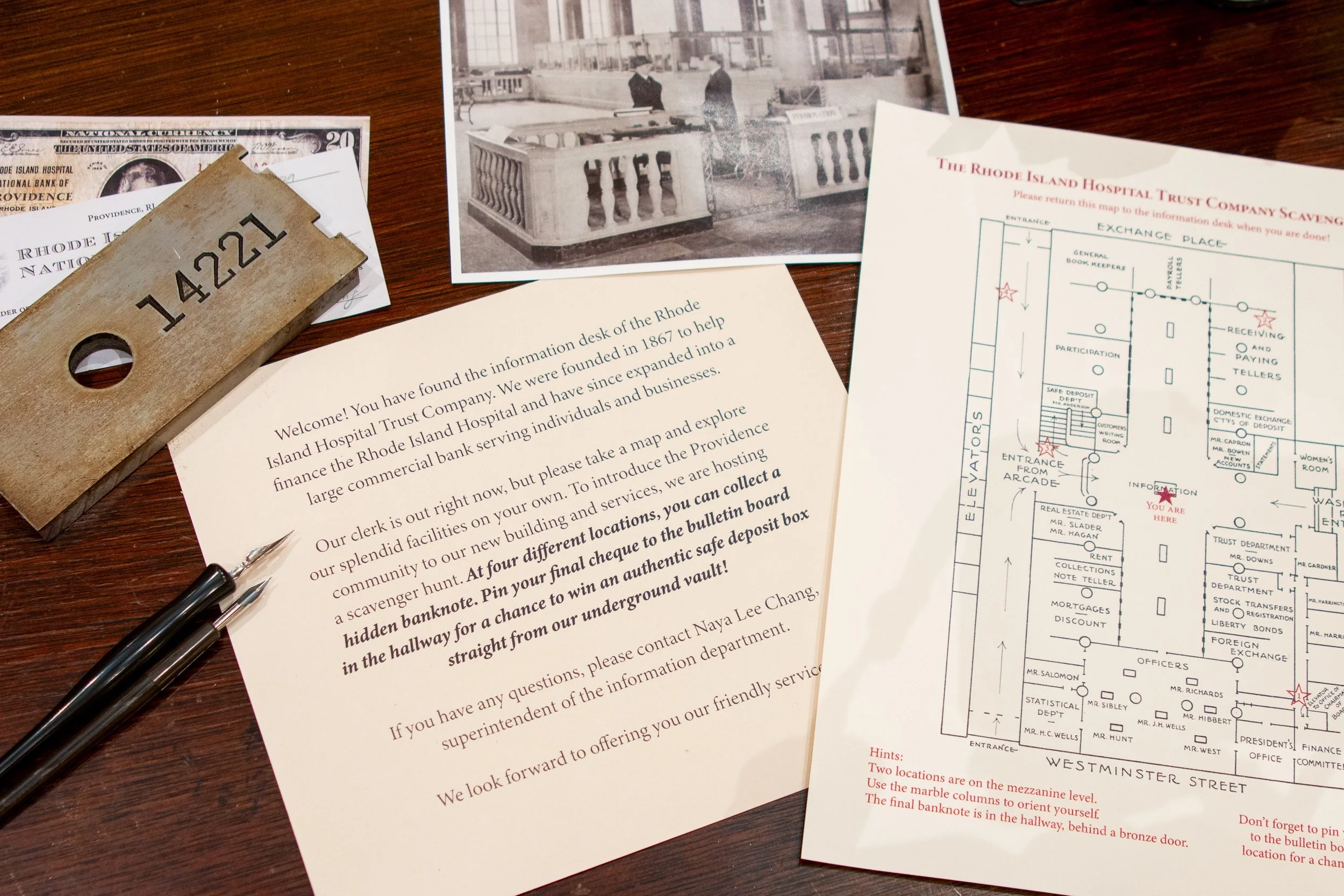 A reception desk recreated from archival photos and placed in its original location drew viewers into the installation. Ephemera on the desk introduced visitors to the function and character of the Rhode Island Hospital Trust Company, and instructions and a map set them on a scavenger hunt. At four different locations, participants collected faux banknotes with information about the company and the building printed on the backs. Those who completed the hunt wrote their name on a blank check to enter a raffle to win an authentic safe deposit box from the vault that still exists in the building’s basement.