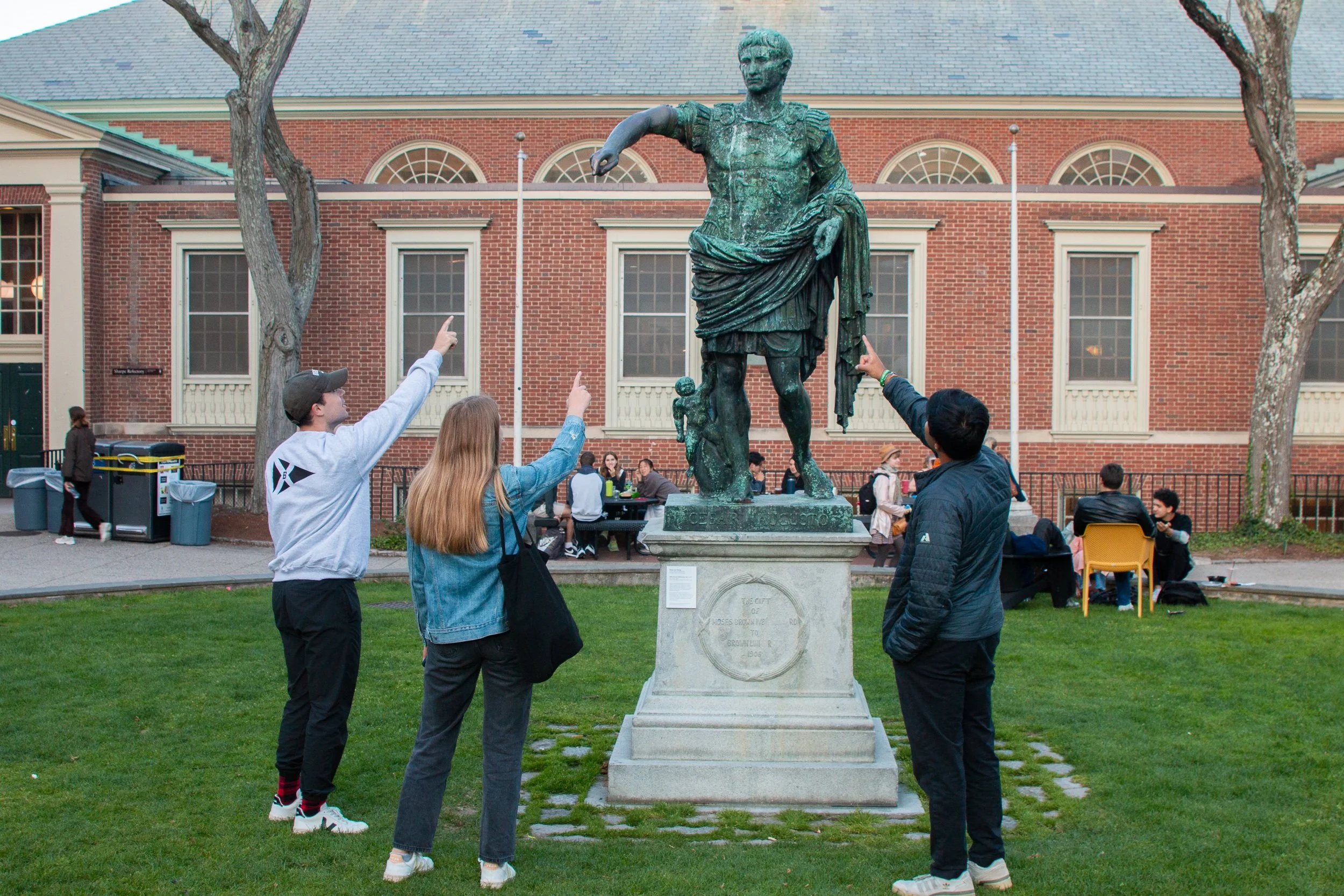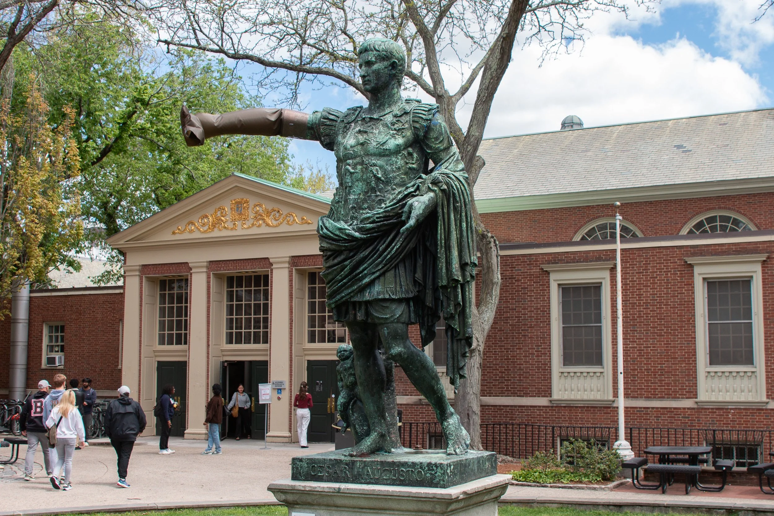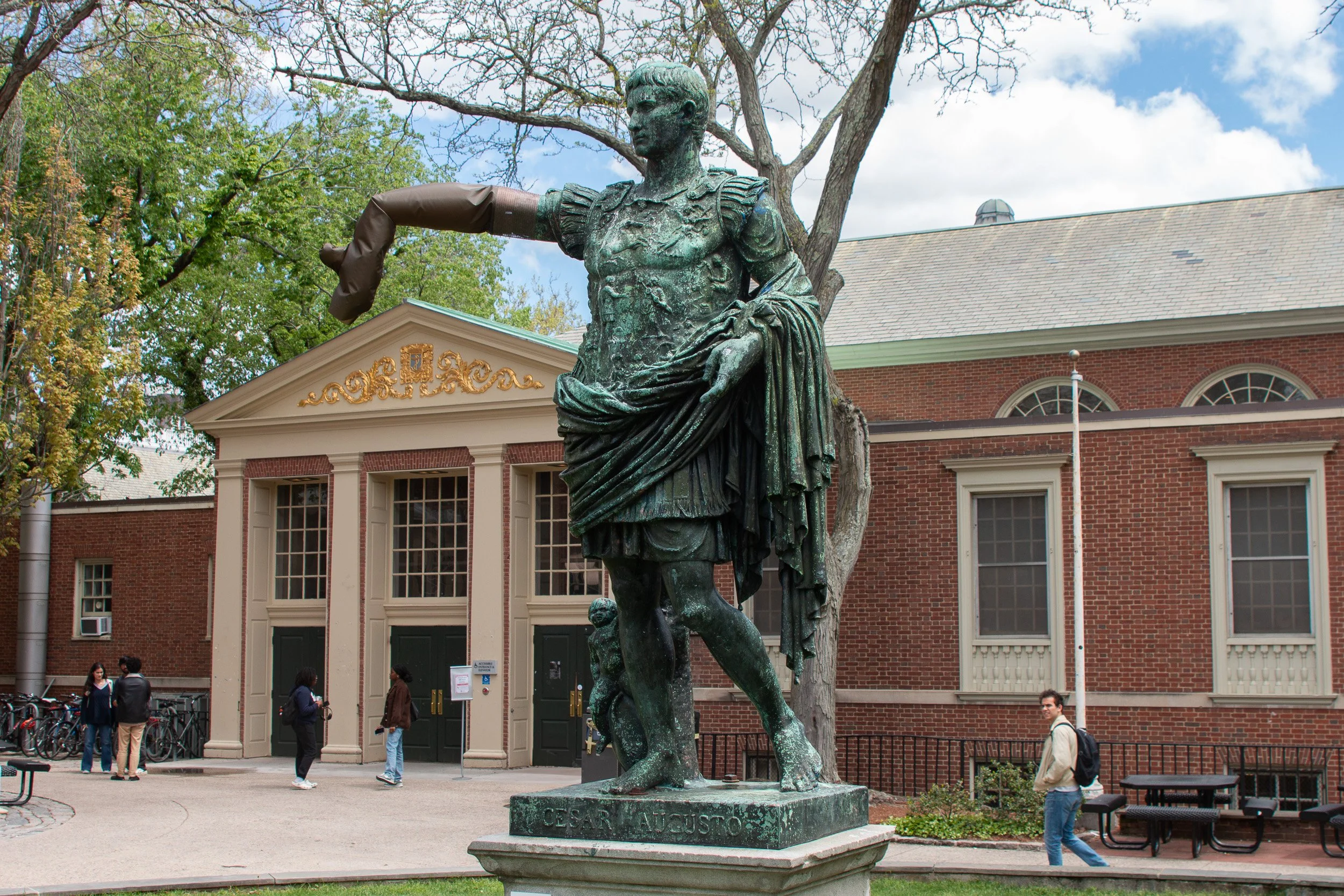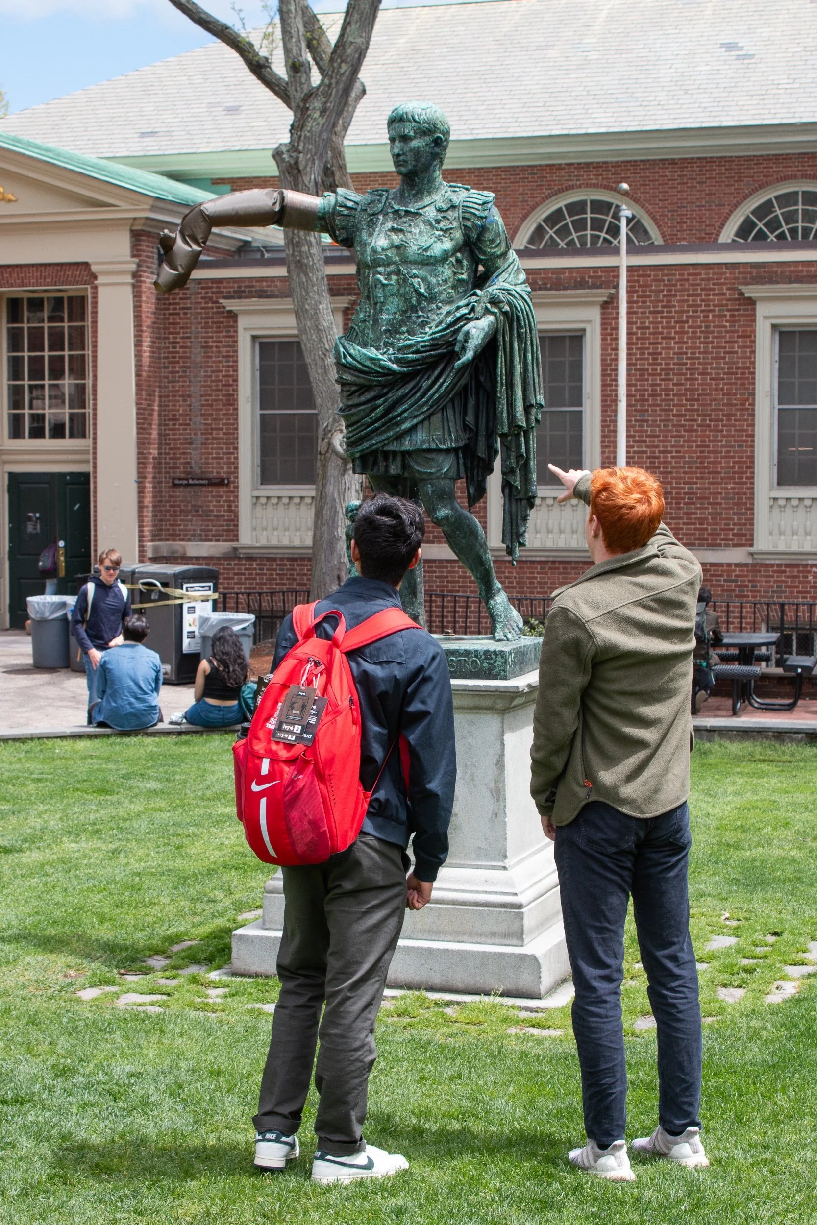 Augustus first lost his right arm in the New England hurricane of 1938. A new limb was attached, but it was severed by vandals in 1960. Though the statue was intended as an emblem of dignity and power, it didn't take long for students to make Augustus an object of irreverence. Missing the arm that overtly signaled his authority, Augustus has been variously littered with empty beer cans, masked for COVID-19, and papered with student organizers' posters.