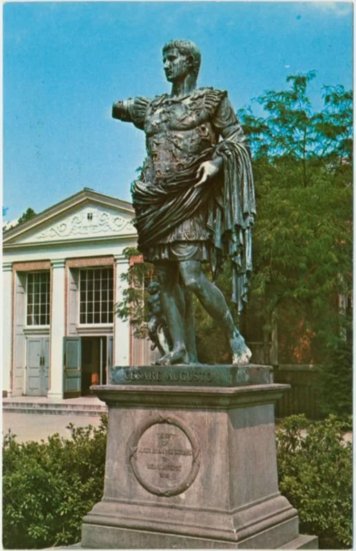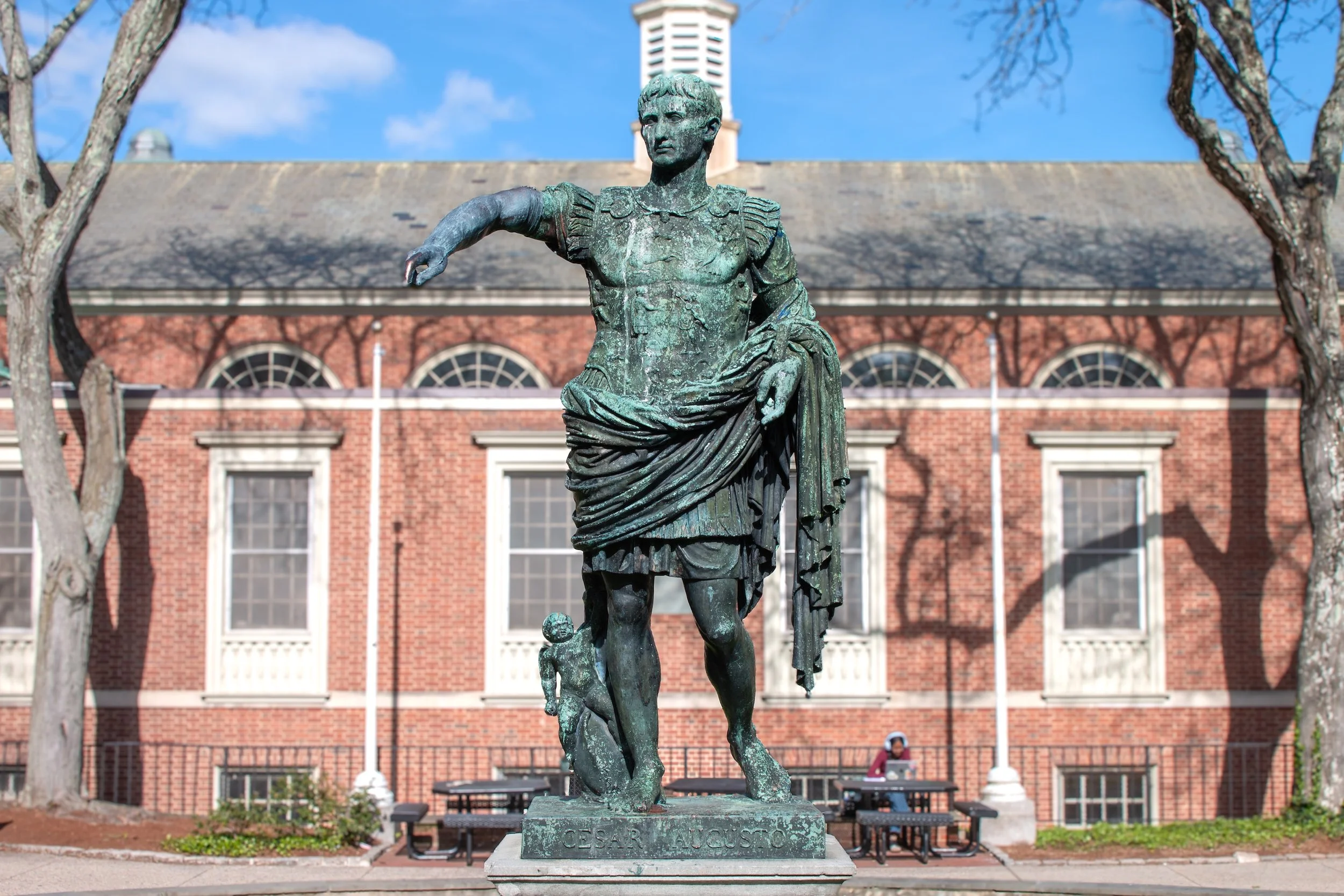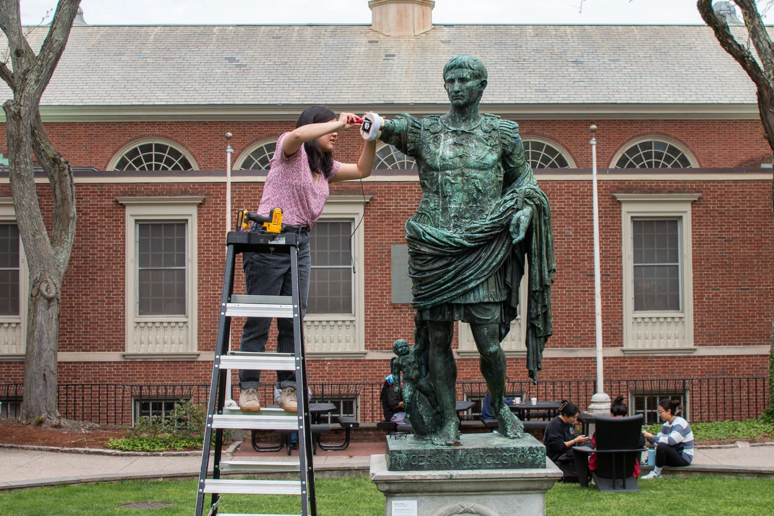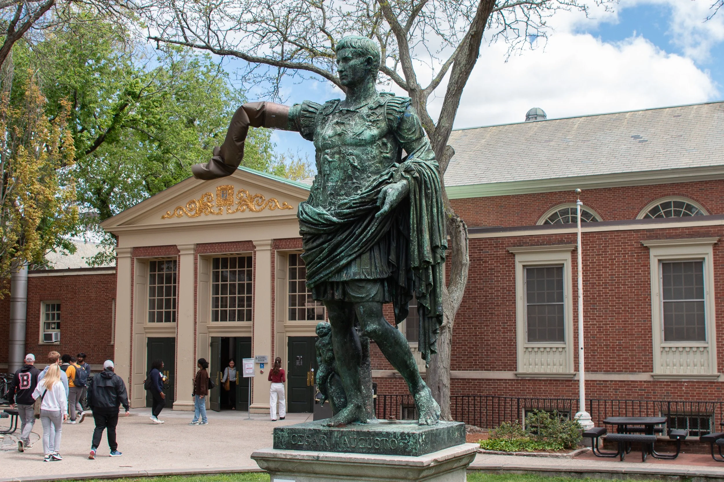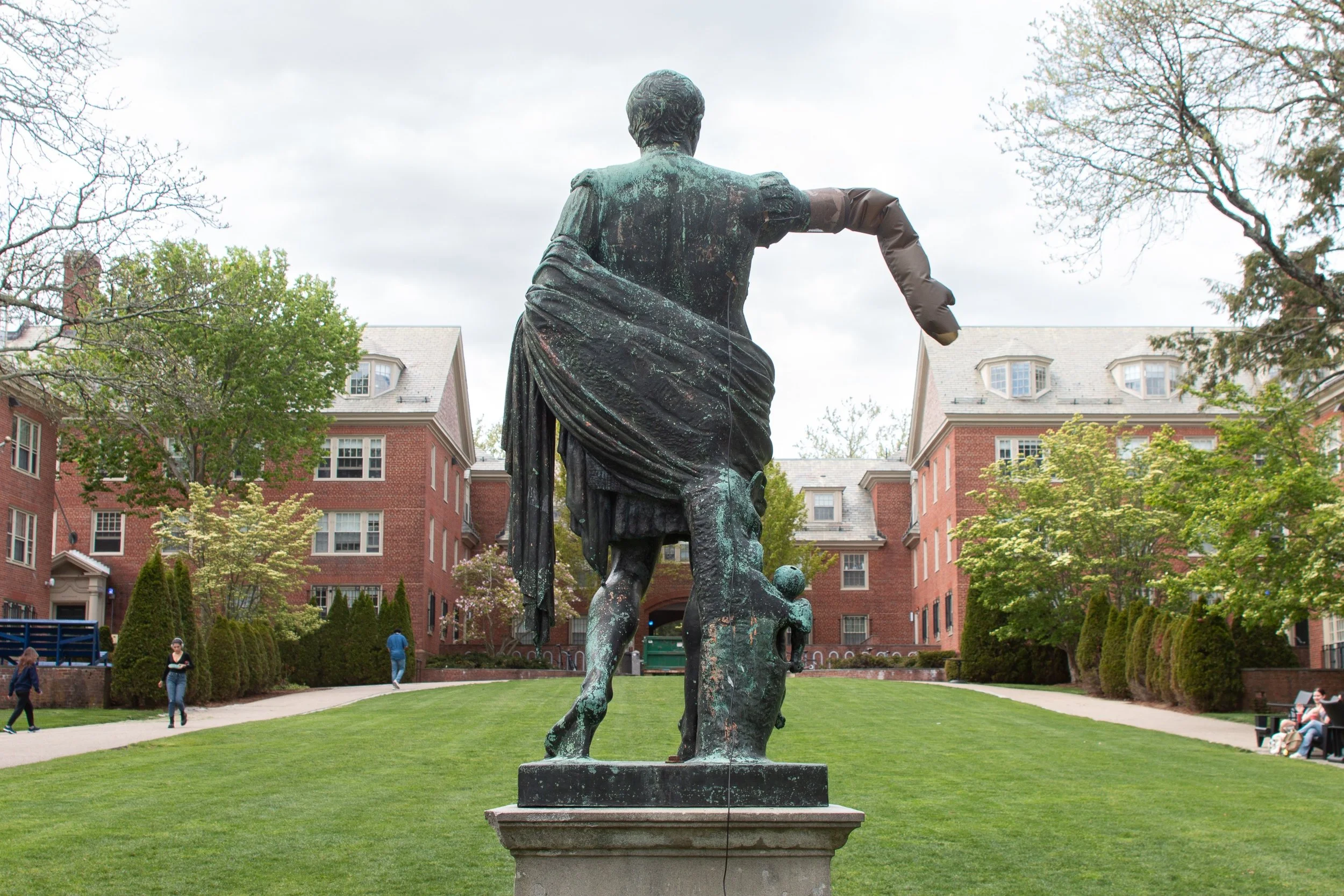 Augustus first lost his right arm in the New England hurricane of 1938. A new limb was attached, but it was severed by vandals in 1960. Though the statue was intended as an emblem of dignity and power, it didn't take long for students to make Augustus an object of irreverence. Missing the arm that overtly signaled his authority, Augustus has been variously littered with empty beer cans, masked for COVID-19, and papered with student organizers' posters.